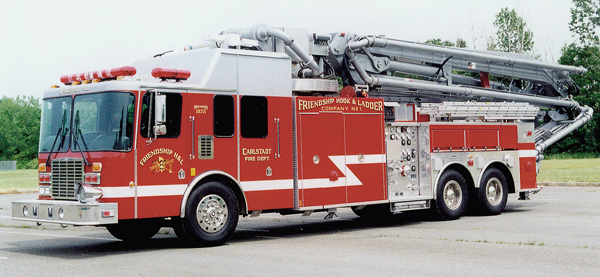 In 1997, the Friendship Hook and Ladder Co. No. 1 received a Schwing 115-foot articulating boom with a HME 10 man enclosed cab and Marion body. This unique apparatus is the first of it's kind in the United States for a municipal fire department.
