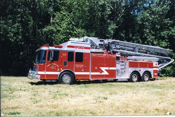 1996 Schwing/HME/Marion – In service October 1997 through August 2014 featuring a 10-man HME cab, a Marion body, 1500 GPM Waterous pump, and a 115' Schwing aerial with 4 articulating booms. The members of the company dedicated this apparatus to Past Chief and member Burton Bello, who died suddenly while an active member of the company. Burt was also a member of the truck committee whose foresight helped to purchase this apparatus. A distinguishing mark of this apparatus was it was the first to be manufactured by Schwing for a municipal fire department in the United States.